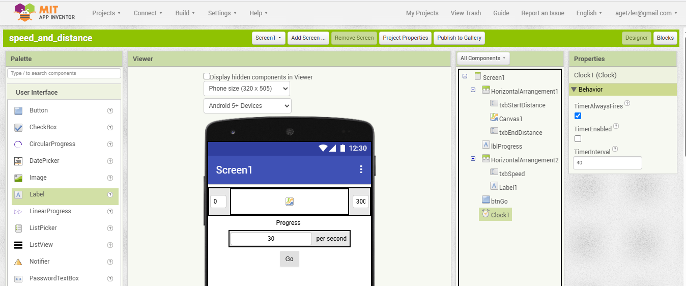 If you run the App and send the child to Position 0 m (the origin) and give him max velocity (65 m/s), since my width anchor is 650, for every 1000 ms (1 s) the child moves 65 m: