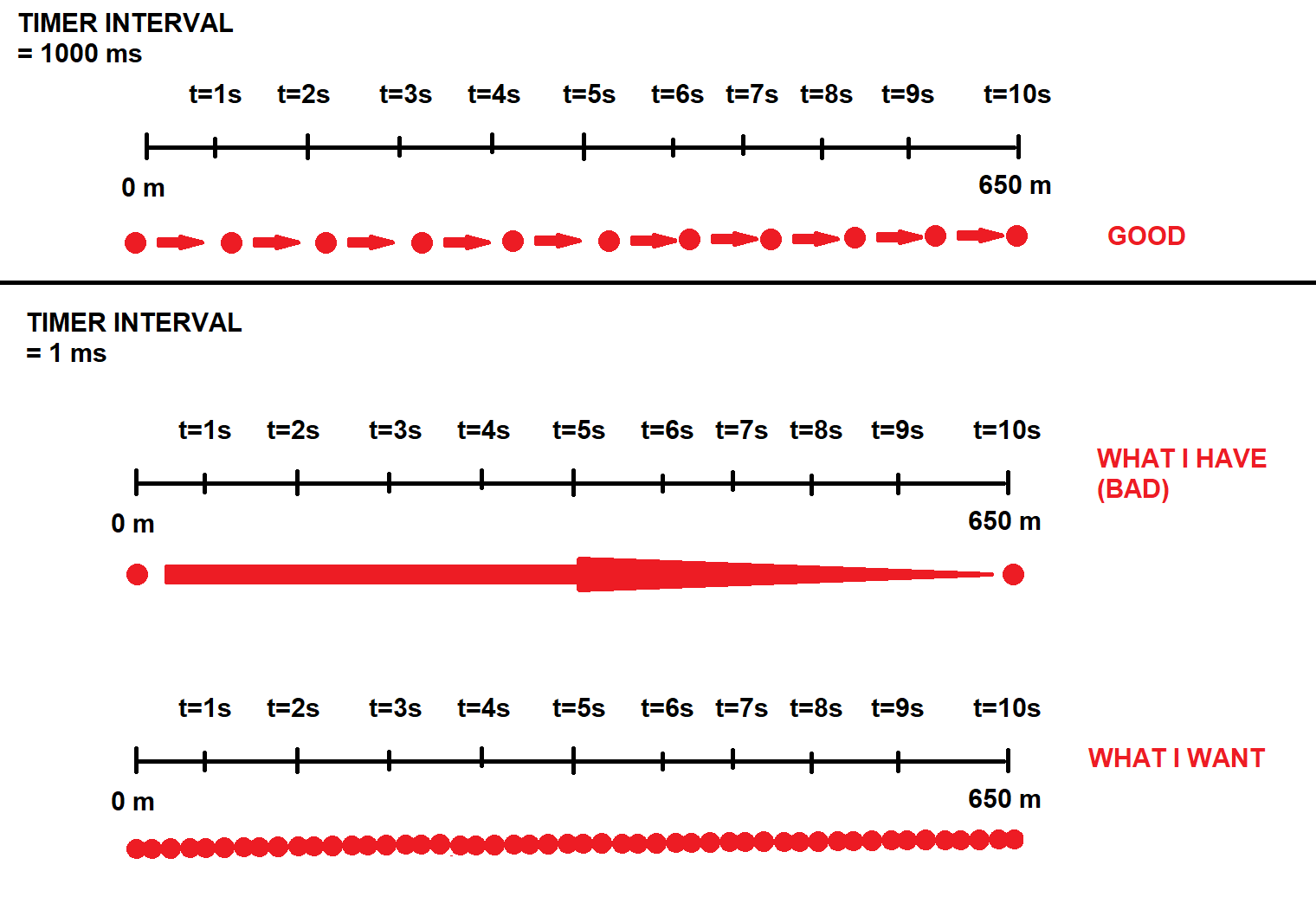 How can we fix this, that is, giving a realistic movement with TimerInterval=1 and also having a final time of 10 seconds? My only tools are integrated blocks and the physics formula for position.