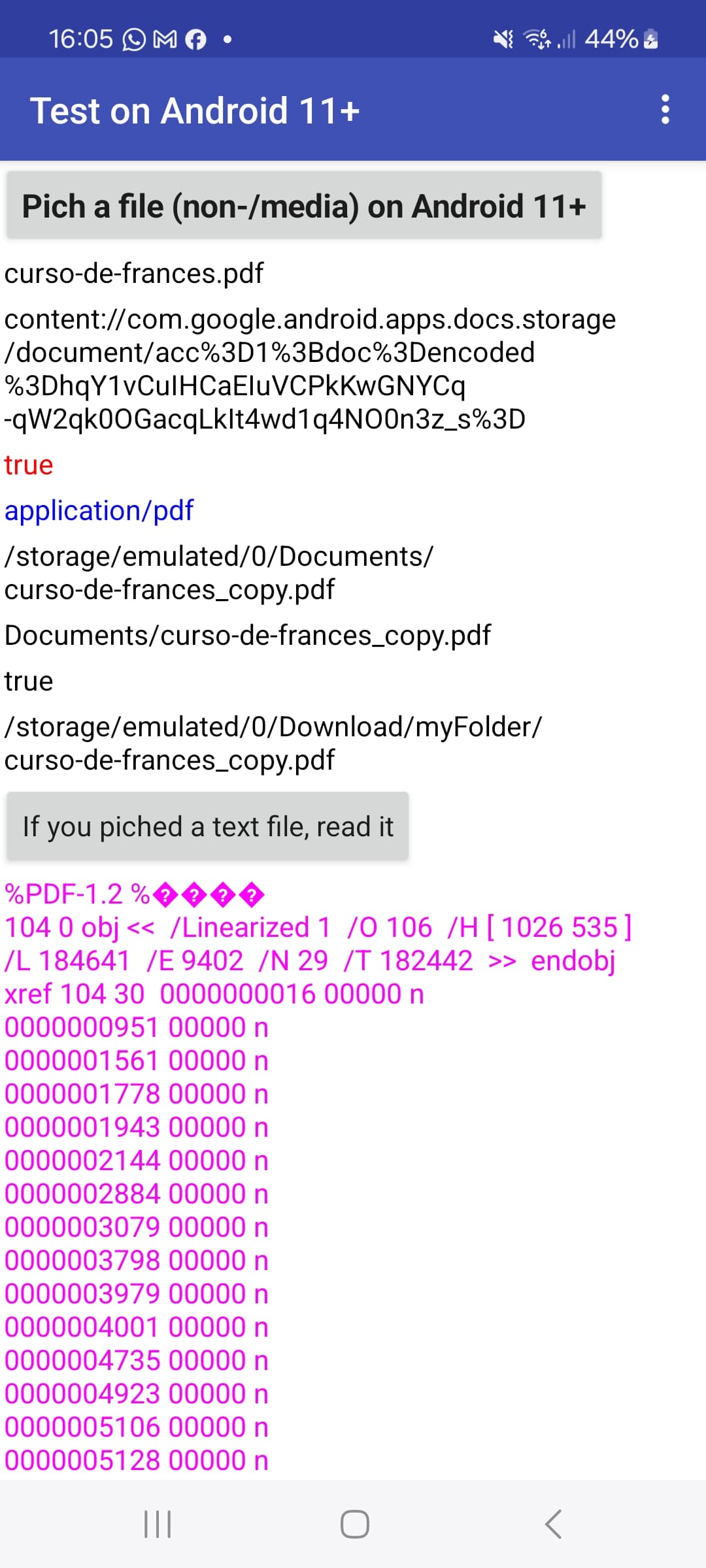 You cannot access non-media files that are not created by the app itself, especially not files outside of the Shared folders on Android 11+. You must use SAF or try this test app: