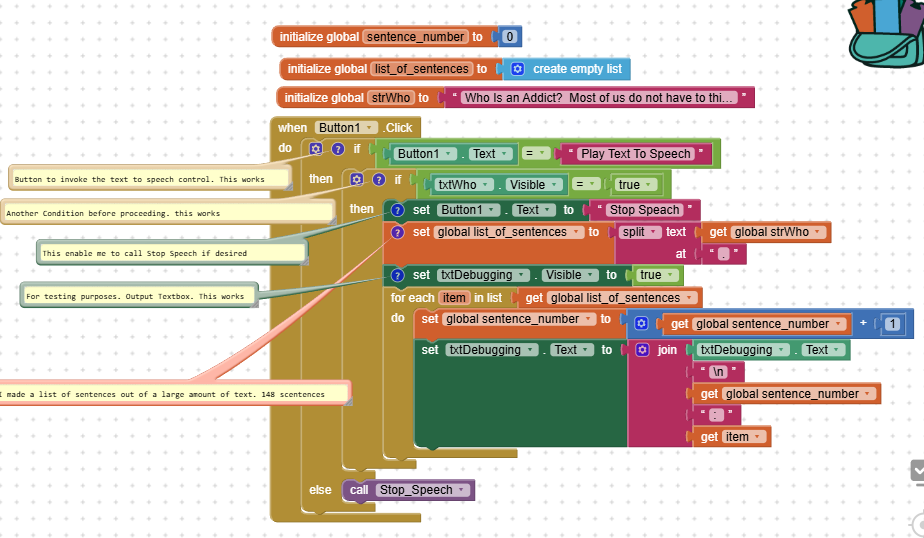 I take it that the condition to check if list is empty is in the after speaking block and is where i would then call the text to speak block with the index 1 of the list of sentences.