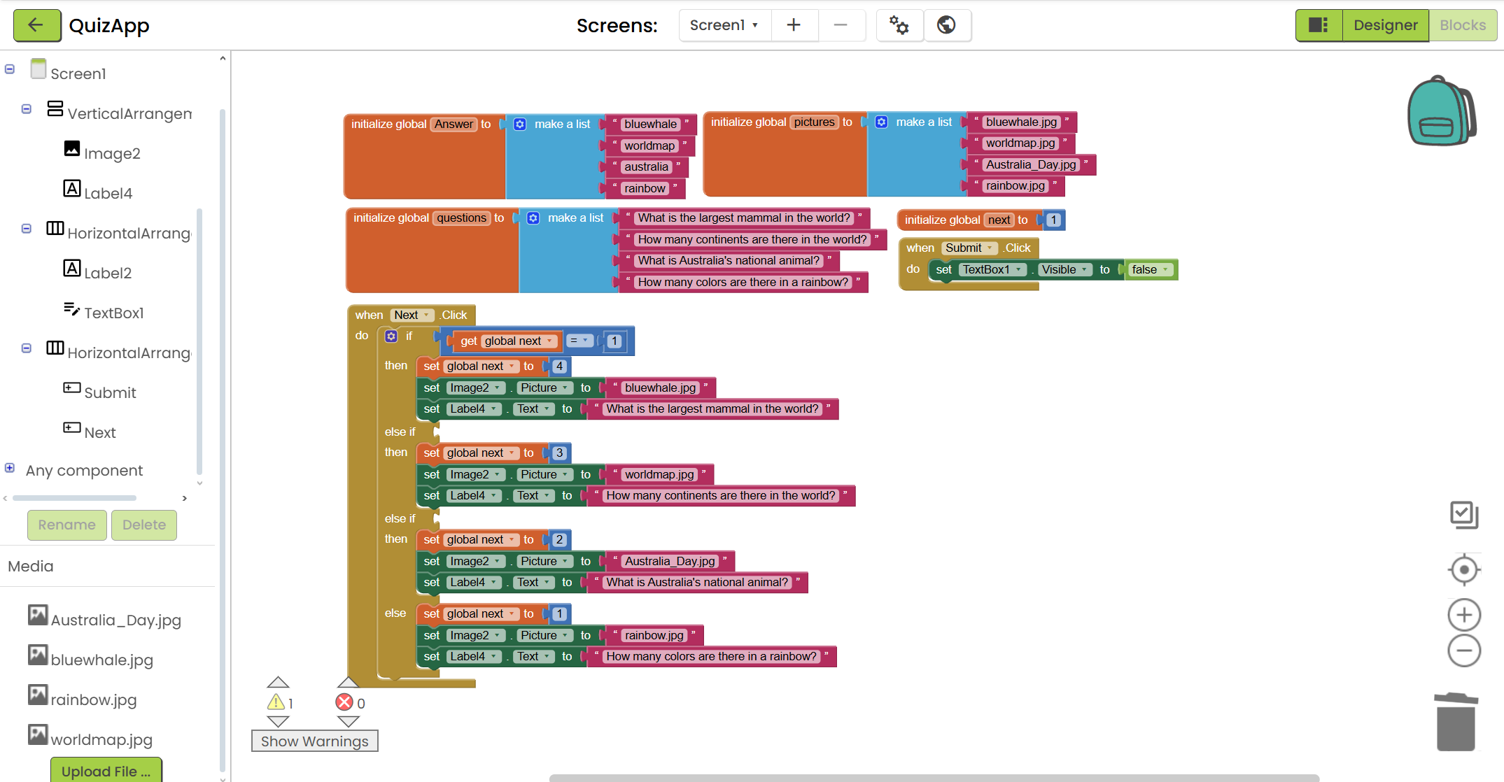 can someone help me, i have no clue what to put in the else if statement to make the actual next button work, it only works for the blue whale and rainbow