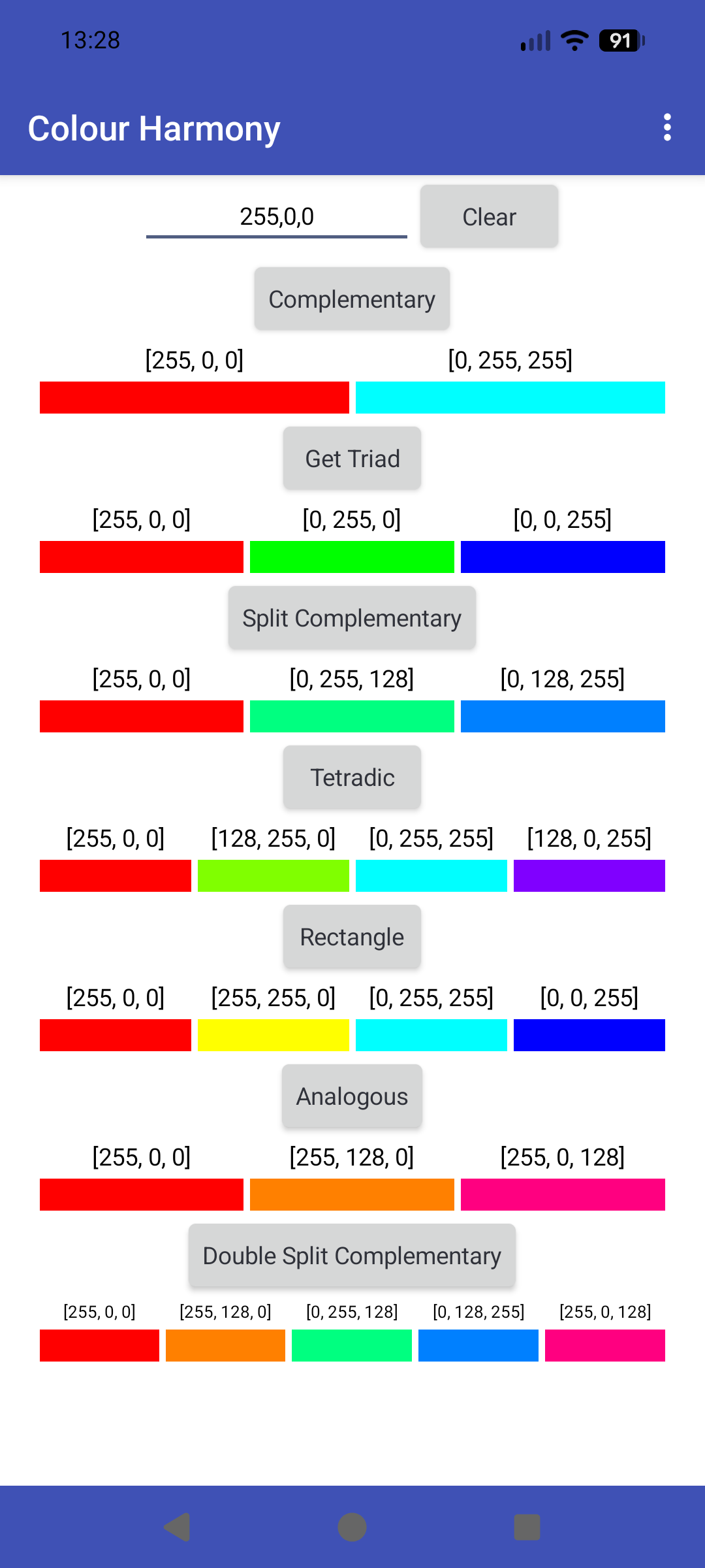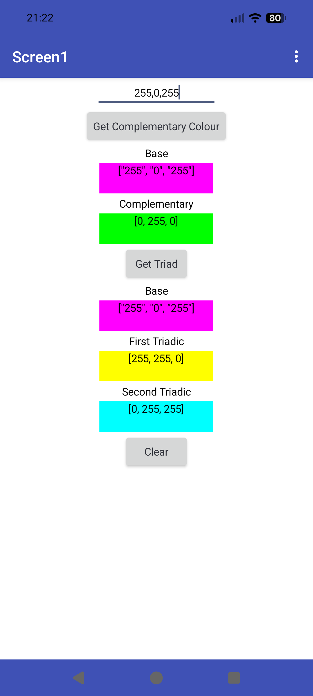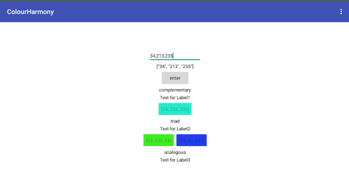 basically the functions convert the rgb input into hsv, complementary and triad function then converts the hsv into the respective complementary(1) and triadic colors (2) and converting it back to rgb for the make a color block for the bg colour of the button.