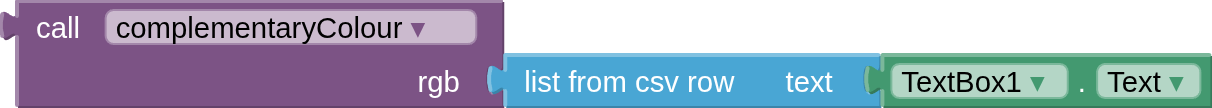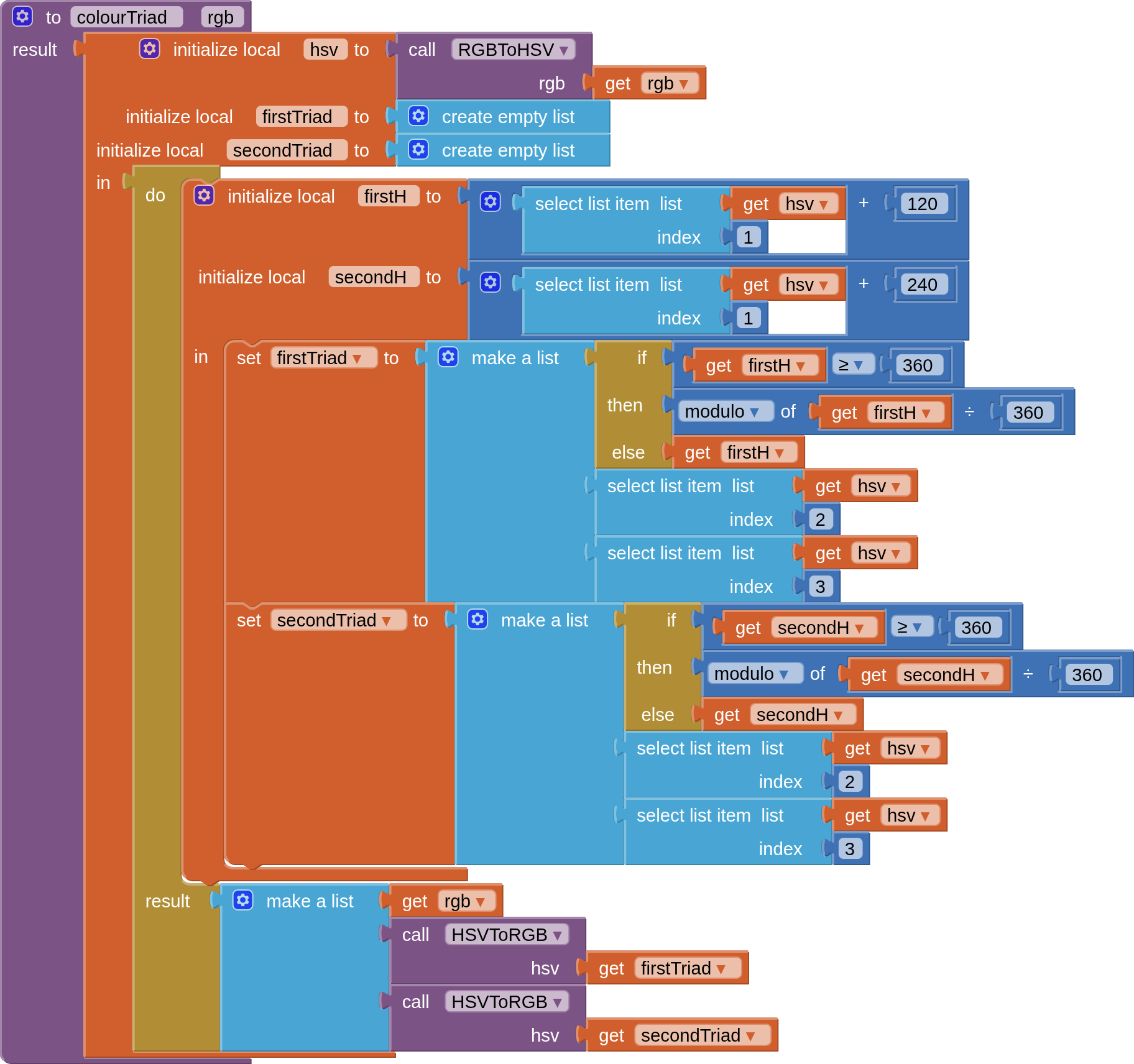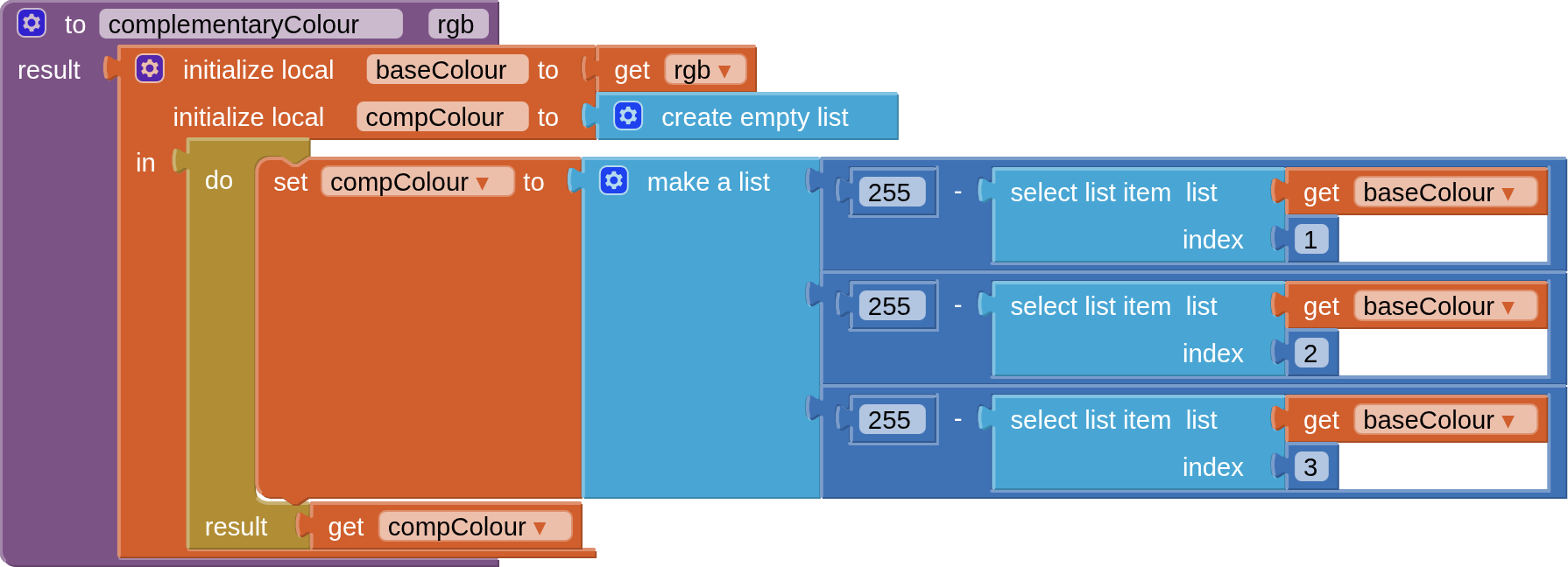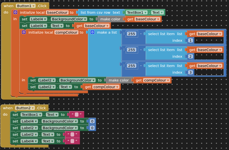 this is an example of the app. When i input an RGB, the colors that output is clearly not a complementary colour of the original RGB. Blocks included above