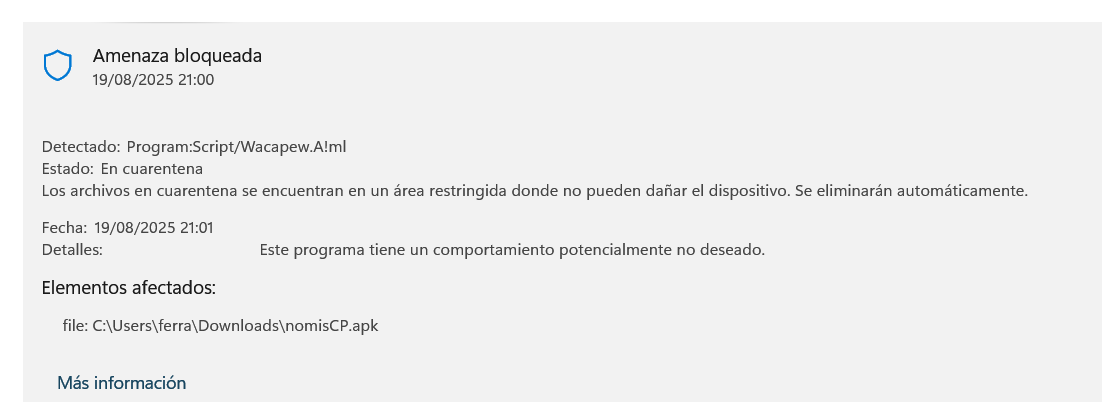 The APK has an script not right (Wacapew.A!ml) for the MS Defender.