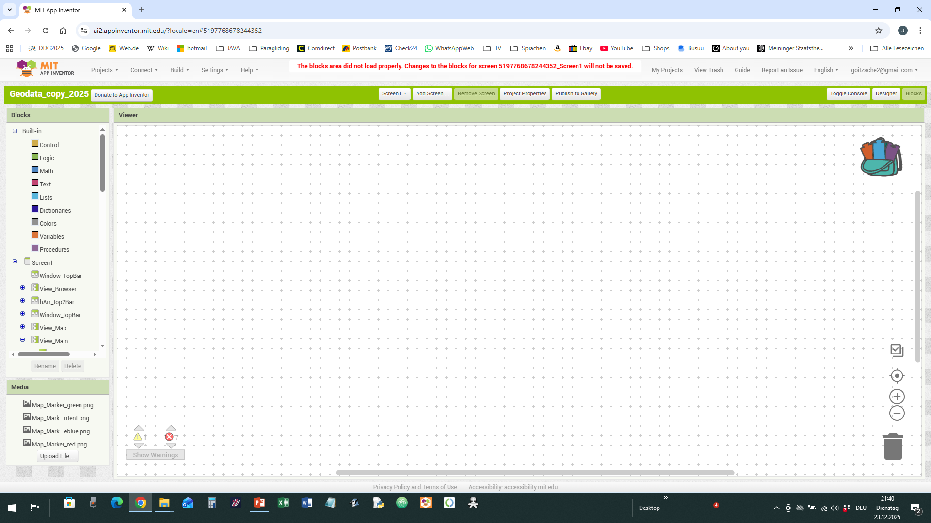 I've lost a complete project (1.7 kB)! only because of a bug within AI2. The story is that I used the right mouse button to duplicate an extended block. This lead to a glued mouse pointer at that block so that I couldn't free the mouse pointer from that block releasing the left button. So I decided to reload AI2 and the result is what you can see in the picture. The issue of a caught/glued mouse pointer already appeared several times in the past, it could be solved by restarting AI2, this time, so far, not! In the past I reported diverse errors/bugs concerning the blocks panel. Now I'm going to stop using AI2. Don't know what really happened. In the farer past there didn't appear errors like that (as well as others). AI2 is not reliable usable. This event is really irritating.
