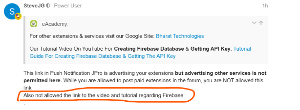 Things like tutorials and videos may only be posted in the appropriate. The Firefase tutorial and video are not posted in Tutorials so it is illegal advertisements.