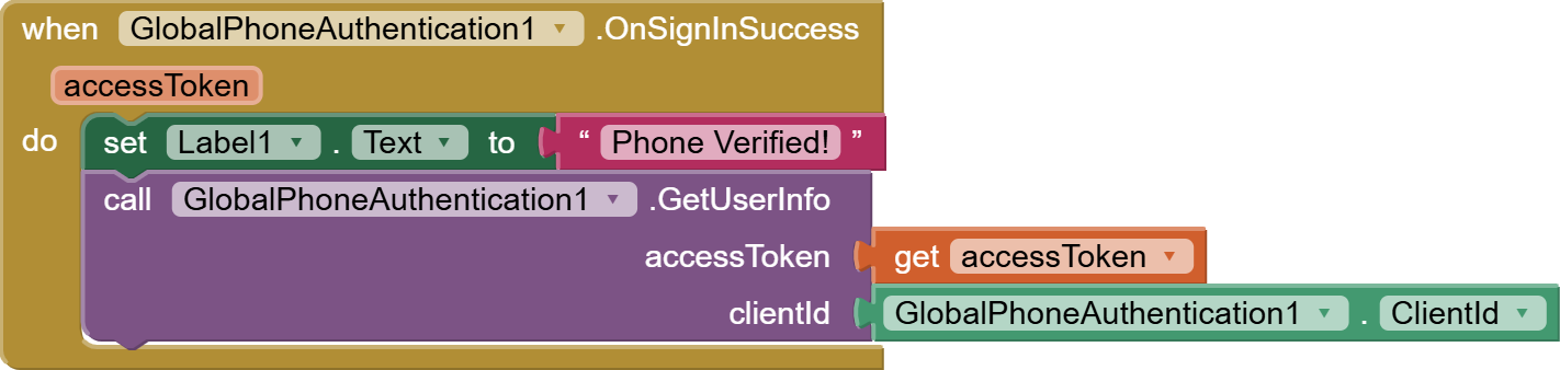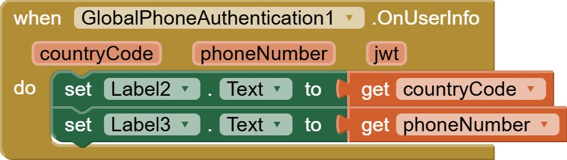 'GetUserInfo' method is used to store the country code & phone number in tinyDB or else where in our app. Fires 'OnUserInfo' event.