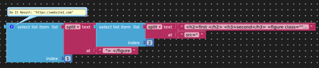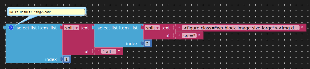 You show a different "html code" each time. You need to be consistent, and ensure that the text elements you want to split by are unique and at the beginning and end of the url. The first split does seem to be consistent - src=", but if the required text split at the end of the url is not always the same - "> alt or "> class, then you will need to test the html code for a unique text before applying the required splits to it.