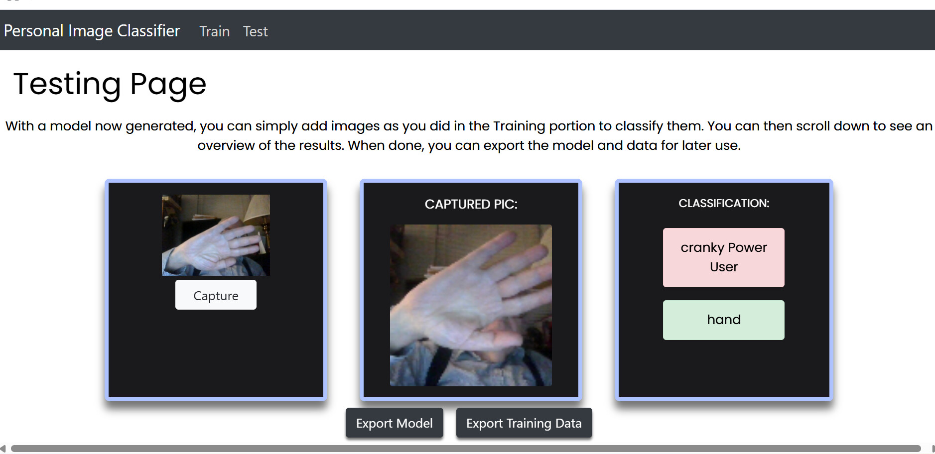 I would like to inform you that I have already resolved the issue. I was able to fix it by using the TMIC extension, which works similarly to the Personal Image Classifier. The extension handled the functionality more reliably and allowed everything to work as intended.