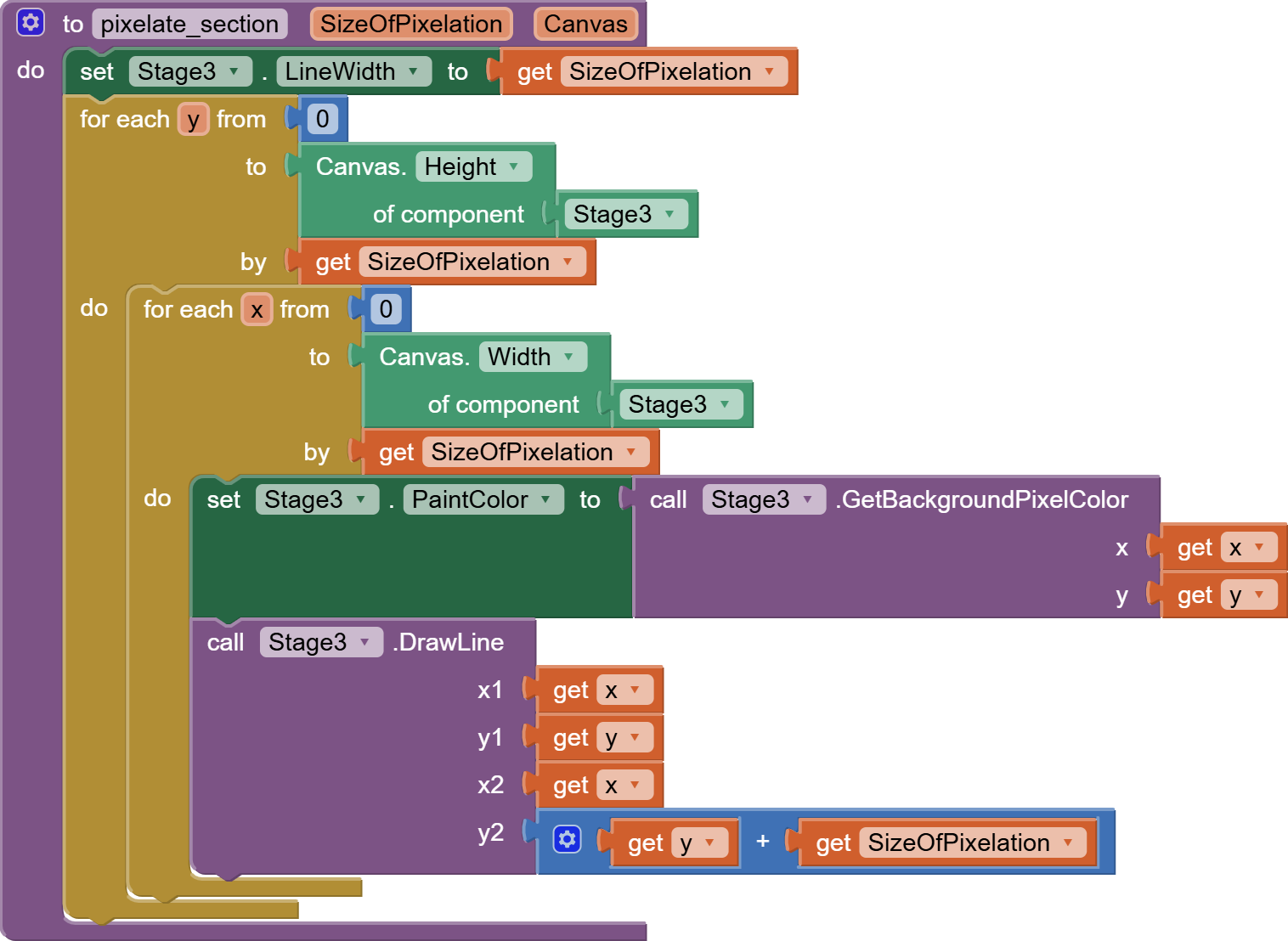 Yes it is . Width is 100 pixel and pixelation size is 10 . I tried to modify the “ for each x “ section changing “ to “ to stage’s width plus 10 , but the result it gives me at that column just white pixels , for any image