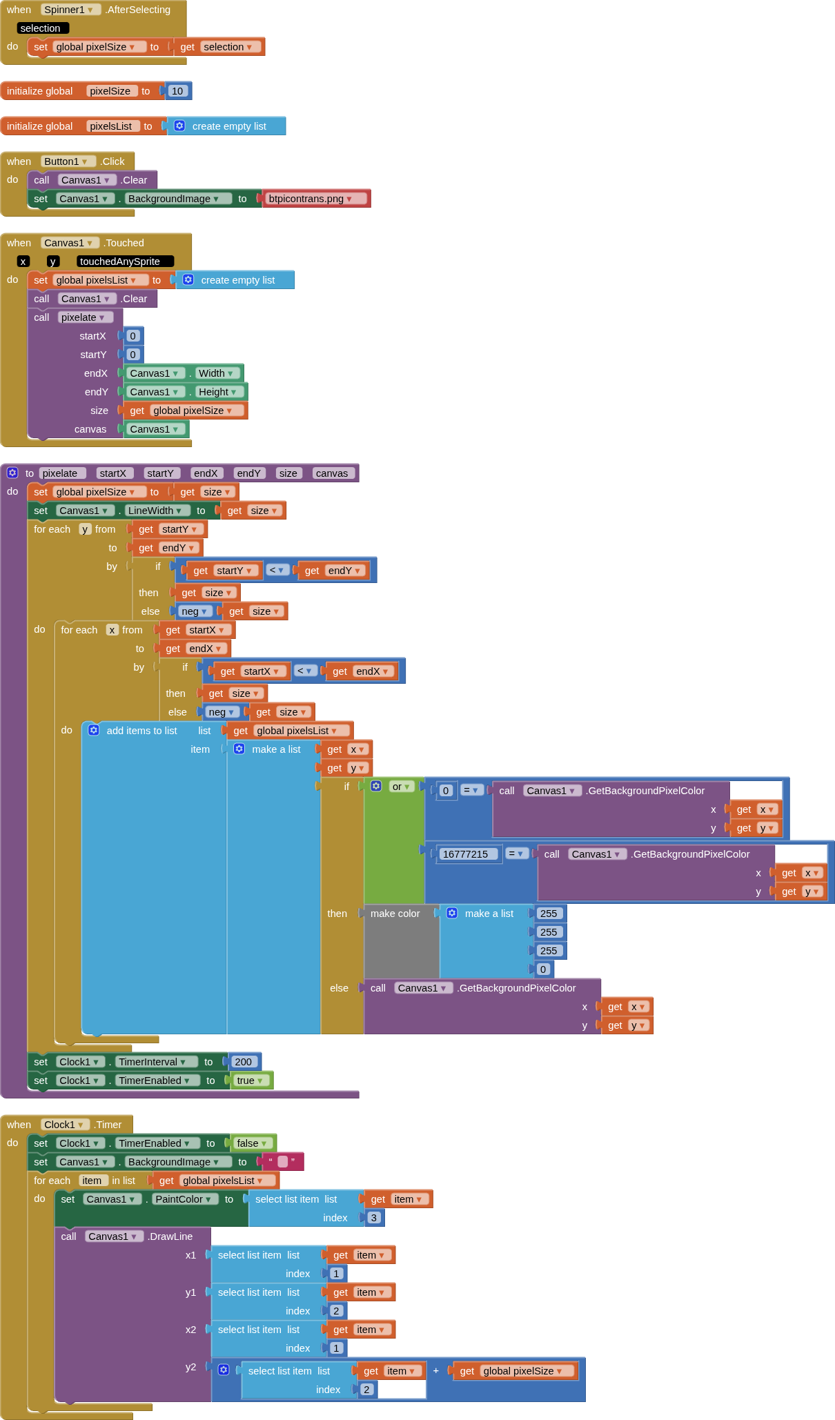 I’ve a bit changed the code to pixelate all the image and not a selected part . But something doesn’t work well because in images with transparent background where was transparent is black ( Well , maybe this is not even an error ) but also it doesn’t pixelate all the image but lets some pieces filled with semi-transaprent color …