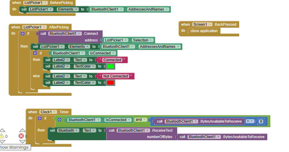 - Use MelonNotification's Build block giving it the title and text (as your BluetoothClient1.ReceiveText block).