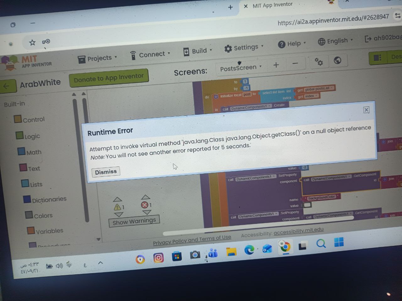 Null Object Reference Error: I am getting a Runtime Error: Attempt to invoke virtual method 'java.lang.Class java.lang.Object.getClass()' on a null object reference (See attached screenshot 1000953905). This occurs during the dynamic component creation phase.