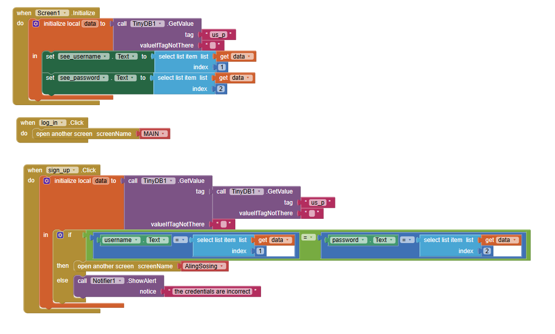 new to MIT app inventor. creating a log-in form but it says "run time error". what would the problem be?