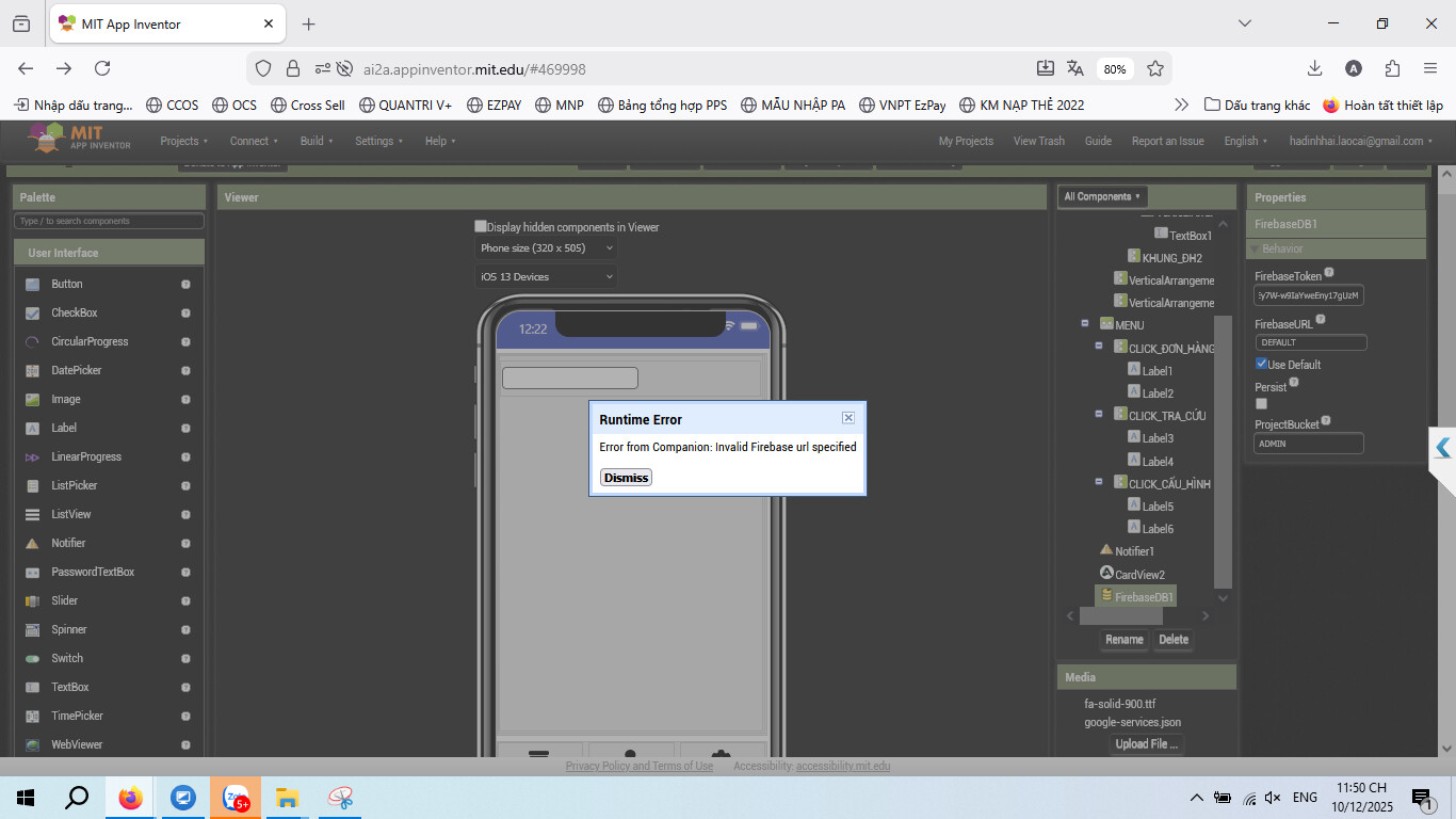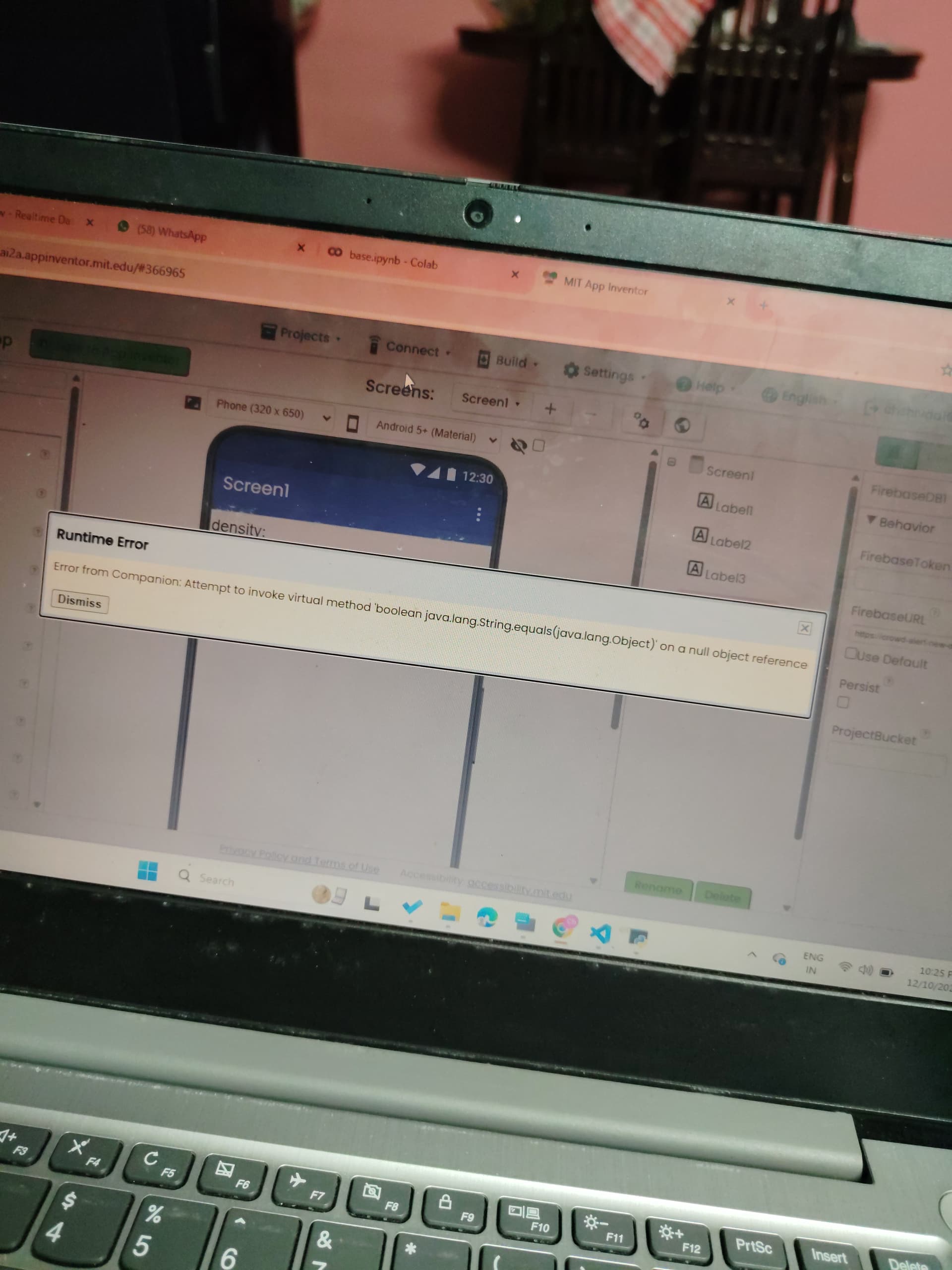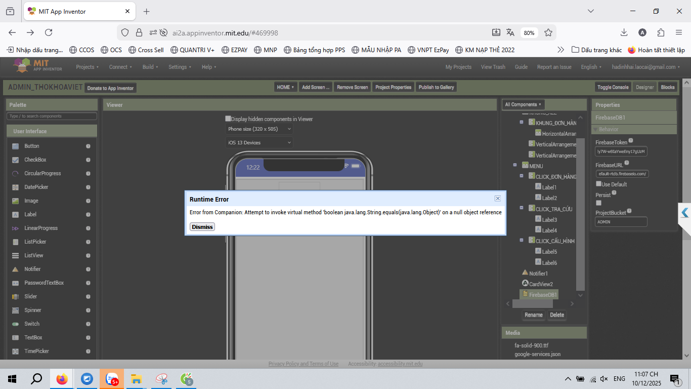 I changed my FirebaseURL and token from the new firebase project I have created. Right when the project loads on MIT app companion, I encountered this error.