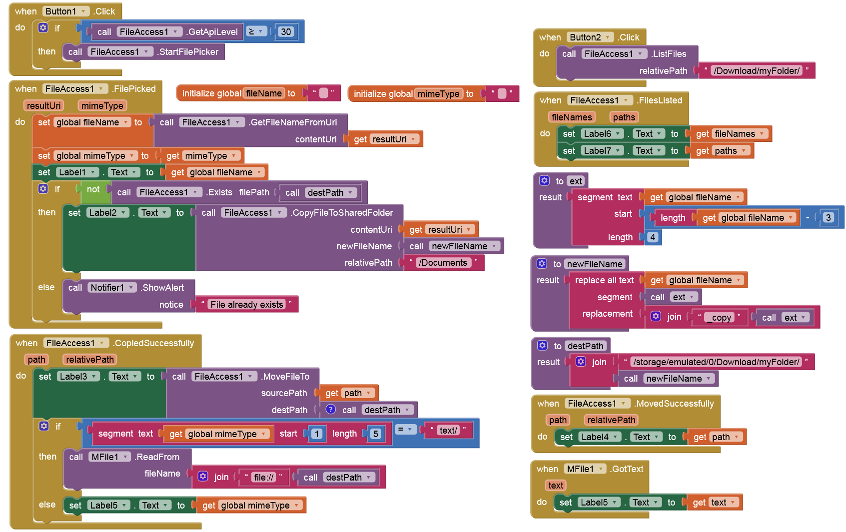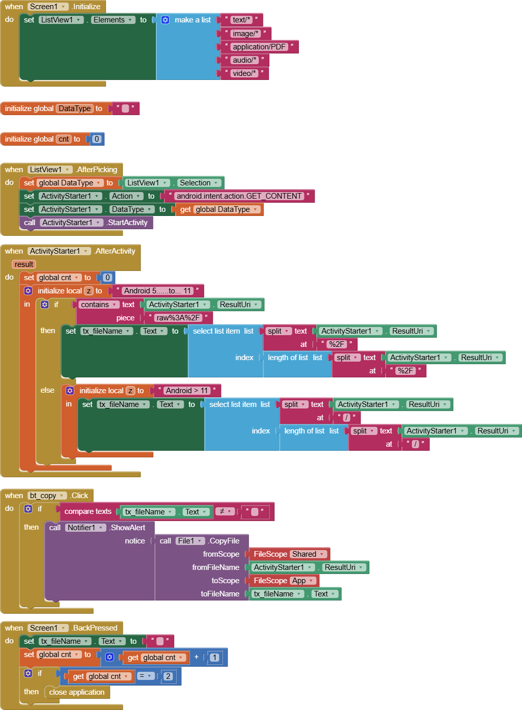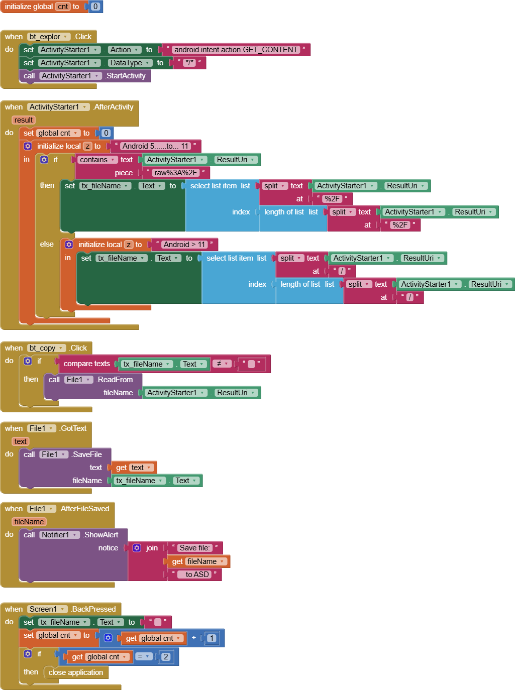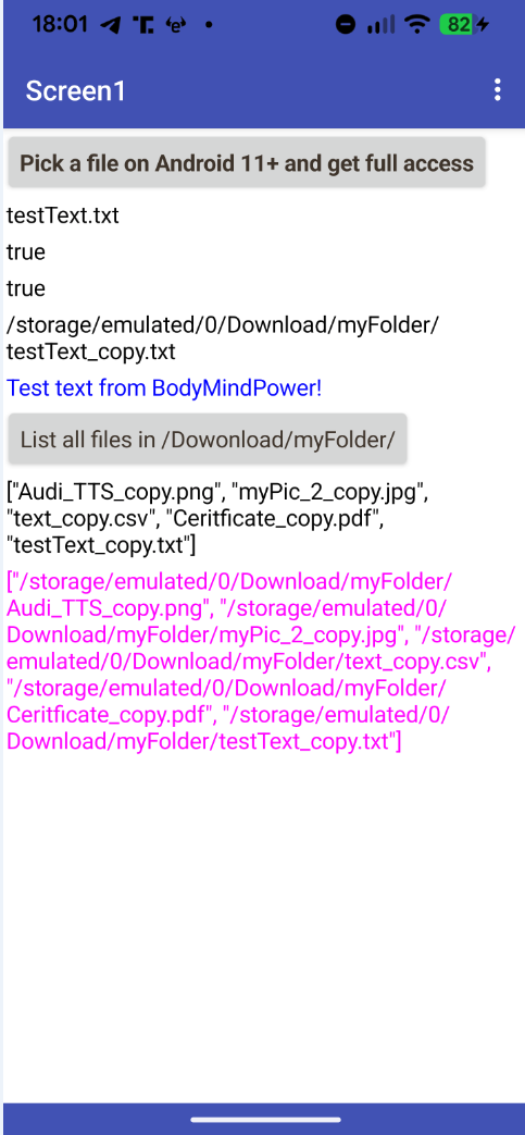 On Android < 11 devices the FilePicker component appears. However, I haven't added any blocks for this case, as it's widely known how it works. Therefore, the app is only designed for testing on Android 11+.