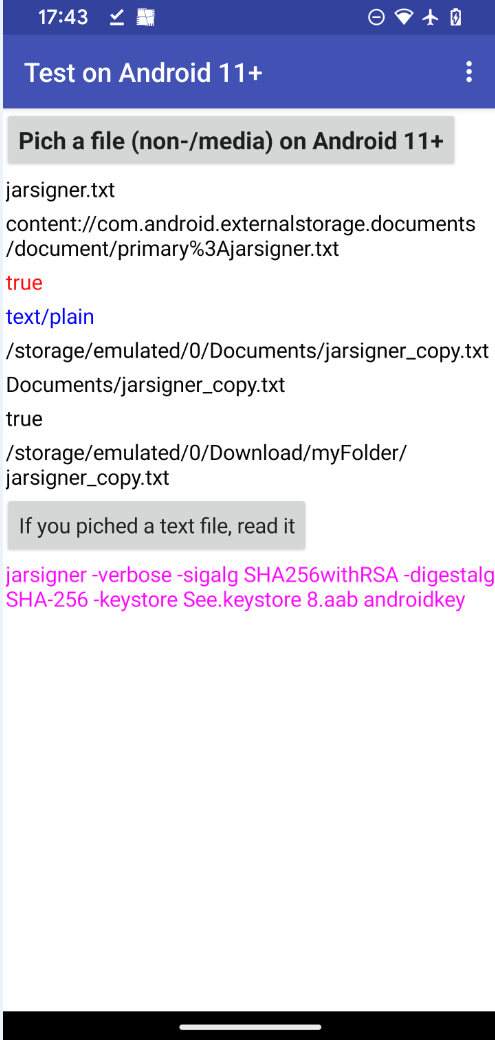 I've added a few more methods, including listing all copied/moved files, to which the app then has full access. This lists the file names and paths. If text/* (mime) files are selected, the text is automatically displayed.