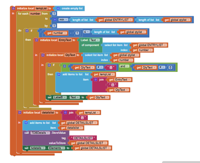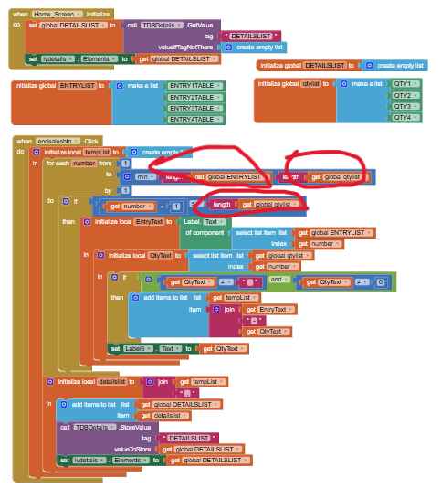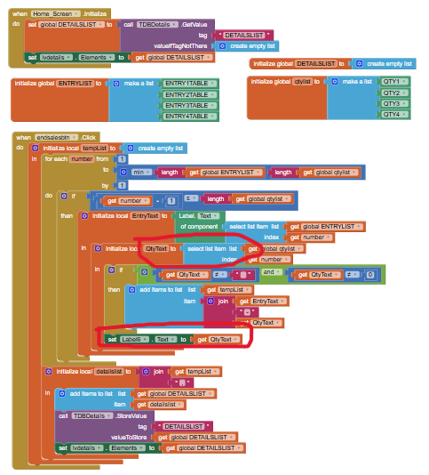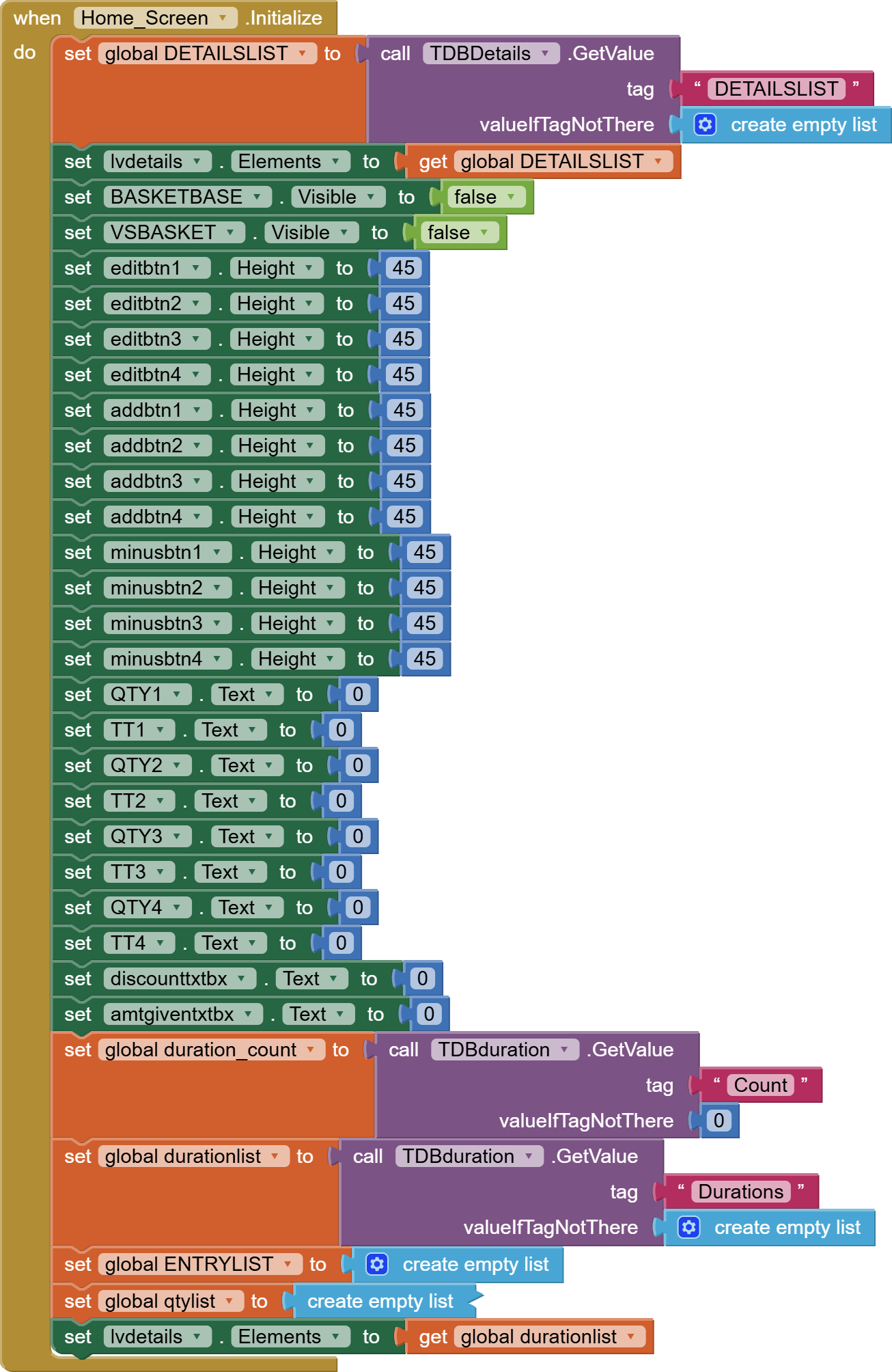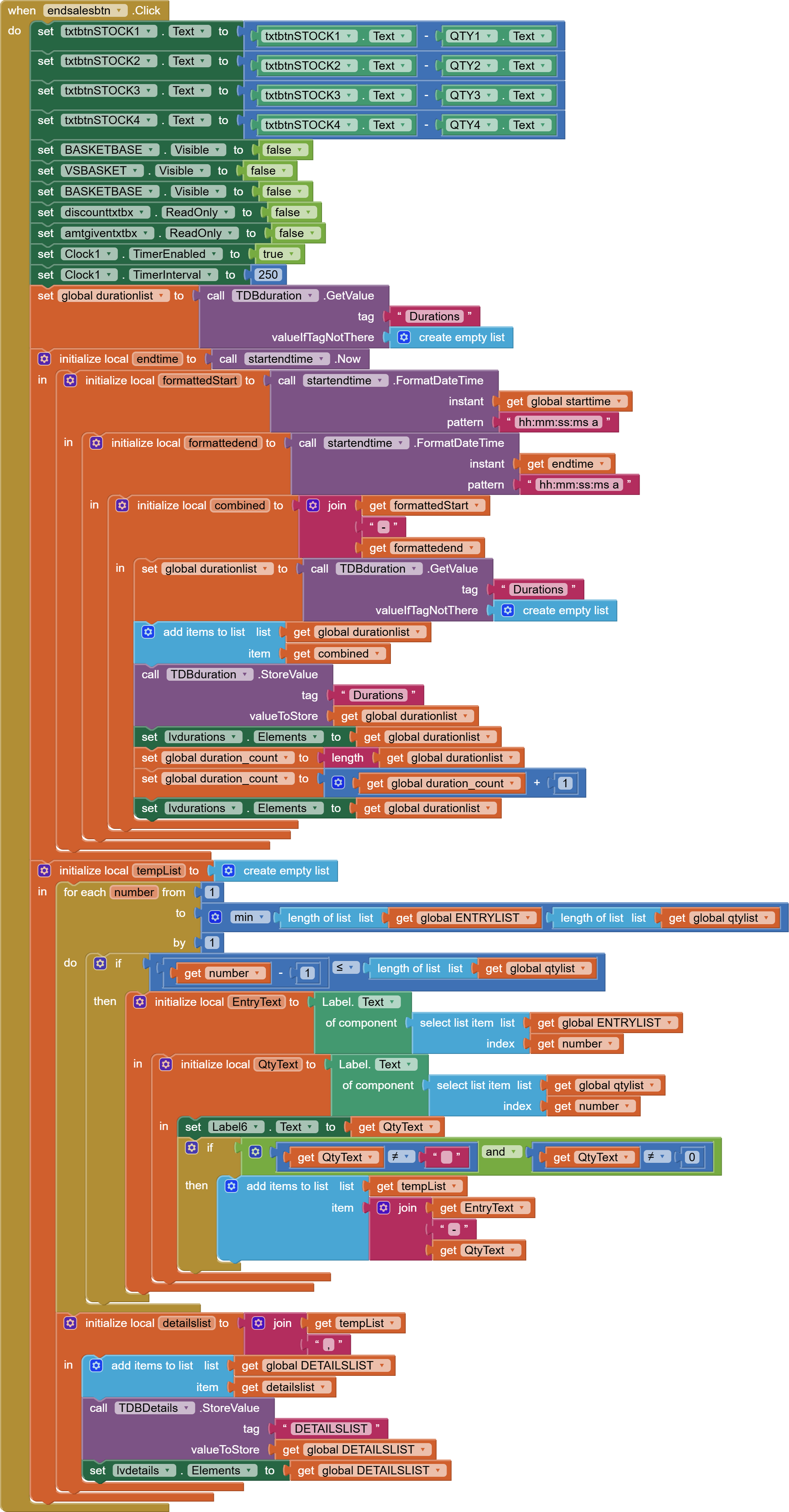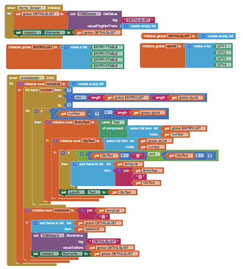 In context to the next image, I separated the blocks — one connected to the HomeScreen.initialization and another connected to the End Sales btn — because I wanted to focus on handling the details part of the proceeds report separately.