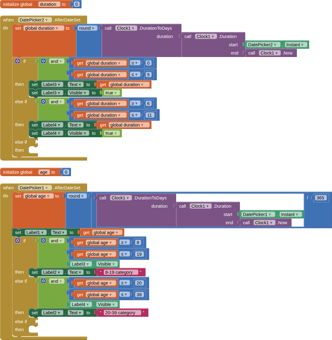 So basically what I'm doing is like a menstruation tracker. First you pick the start of your latest period (which sets a certain layout depending on the day(s) to visible) and that part (the left block of code) is working fine. My problem is with the right block as the "phase" and "info" labels aren't showing in every combination. I need the age as it makes a difference in each phases so I tried doing age picked and phase layout visibility to true as conditions to show those texts but it seems that they aren't working.