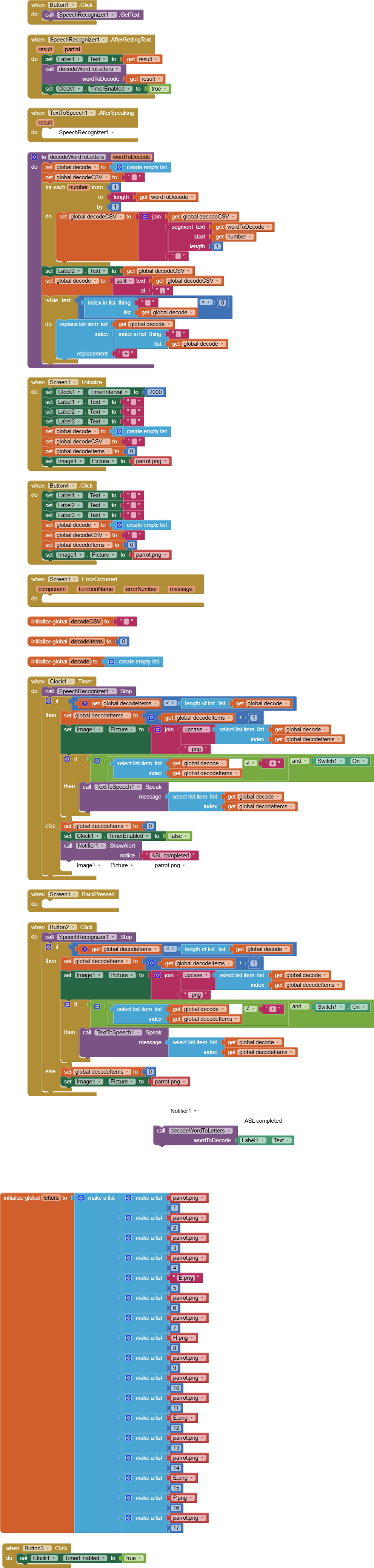 The decodeWordToLetters Procedure captures the SpeechRecognizer text. Label2 displays the individual letters of the text. The display rate of the signs is controlled by the Clock1.TimeInterval (currently set to 2000 ms [2 seconds] in Screen1.Initialize). Add Blocks to make this display rate selectable based on your preferences).