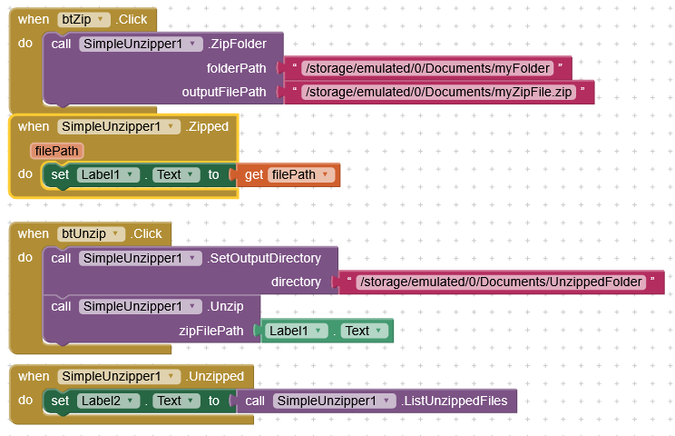 Hi Anke, I'm a beginner and tried using your SimpleUnzipper1 extension, roughly copying the blocks from your example. My folder "/storage/emulated/0/Documents/myFolder" only contains a .txt file; the file "myZipFile.zip" is created, but it's empty. Of course, when I try to unzip it, it doesn't produce any files. What am I doing wrong? It would be great if the zipped file could be password-protected. I've attached my blocks, thanks a lot.