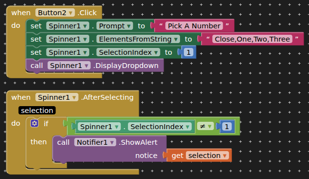 import .aia from first post , compile and and check app : spinner doesn’t work well (select the third item, then select the third item for the second time and the “Spinner.AfterSelecting” does not trigger. Continue to select the third item and no trigger anymore until you select a different item)
