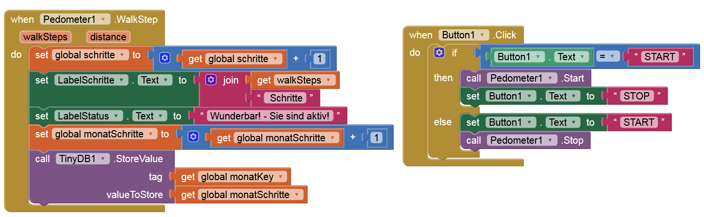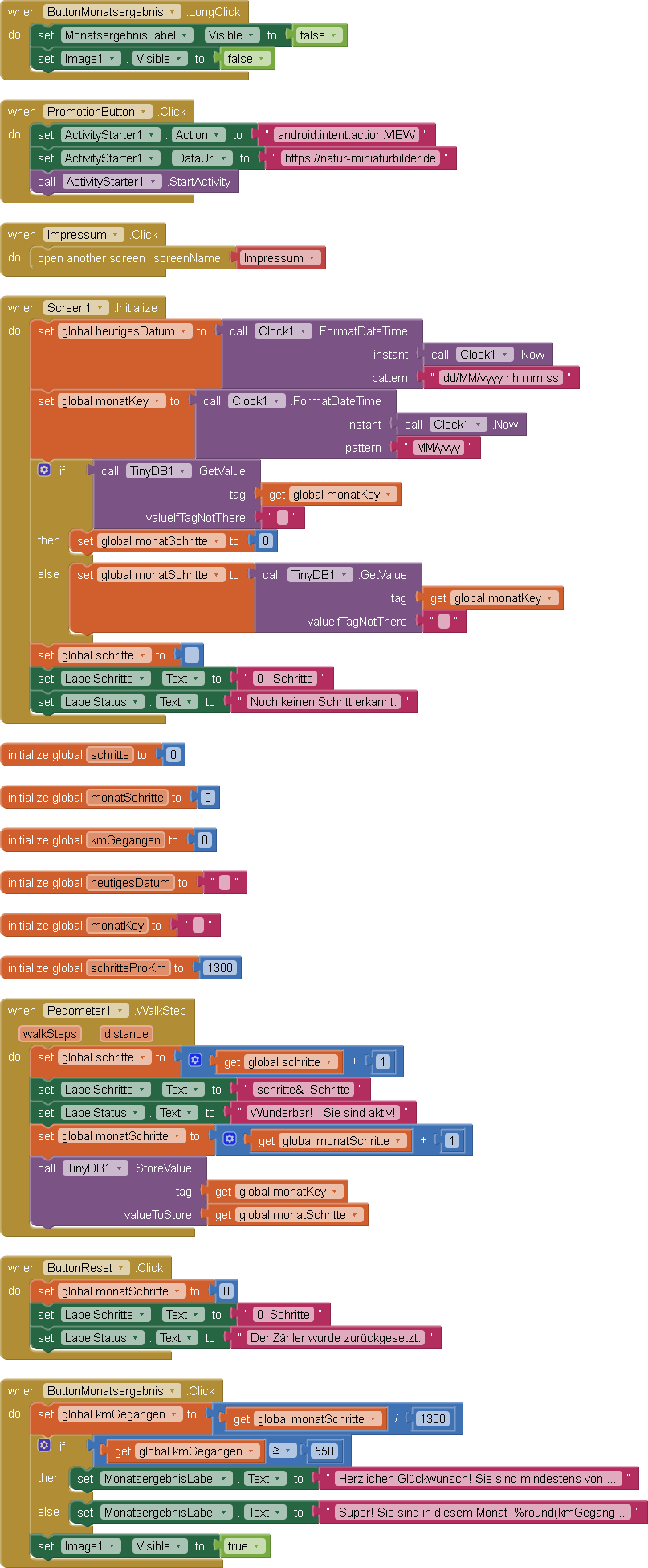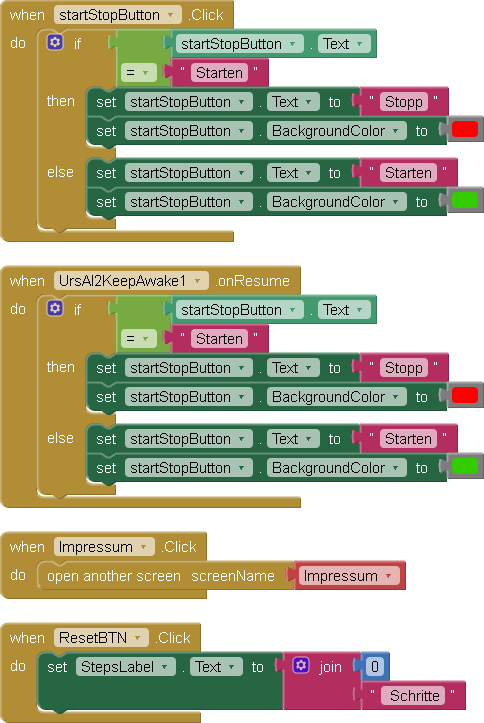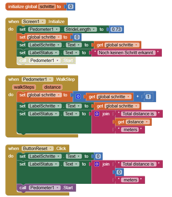 The other problem is, that my step counter does not count and also the placeholders for variables are not really correctly I think. I upload the AIA file and a screenshot of all my blocks in the app. I would be really happy, if someone please could help. But the app is in German language and also the programming names are in German, perhaps someone who speaks German would please like to help. Thank you very much. Have a great day!