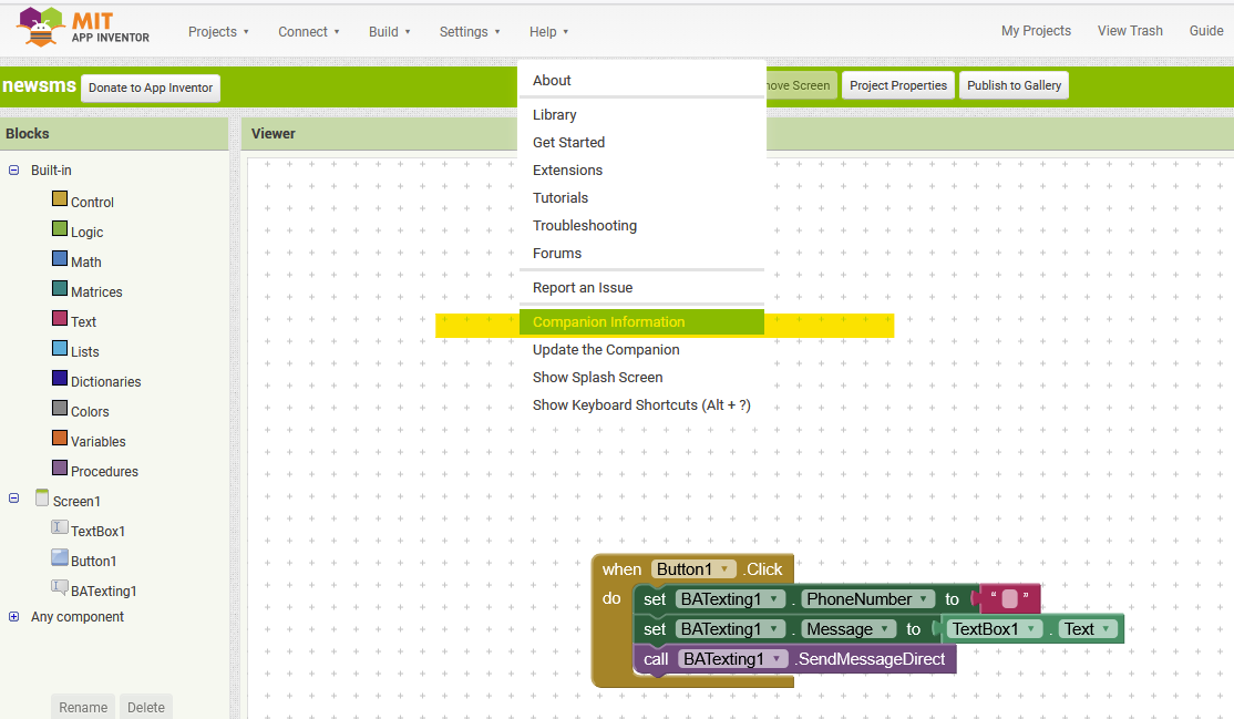 "I am using the official server: ai2.appinventor.mit.edu. The SendMessageDirect block is still present in my Blocks Editor and I can add it to my project. If it was removed from the code base, why is the block still available in the UI? My project relies on sending SMS automatically for a beekeeping monitor. If this is deprecated, what is the recommended way to send background SMS now?"