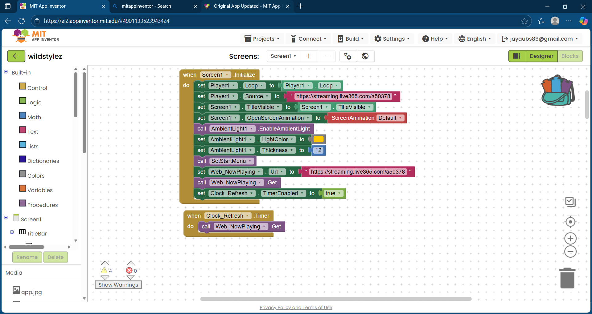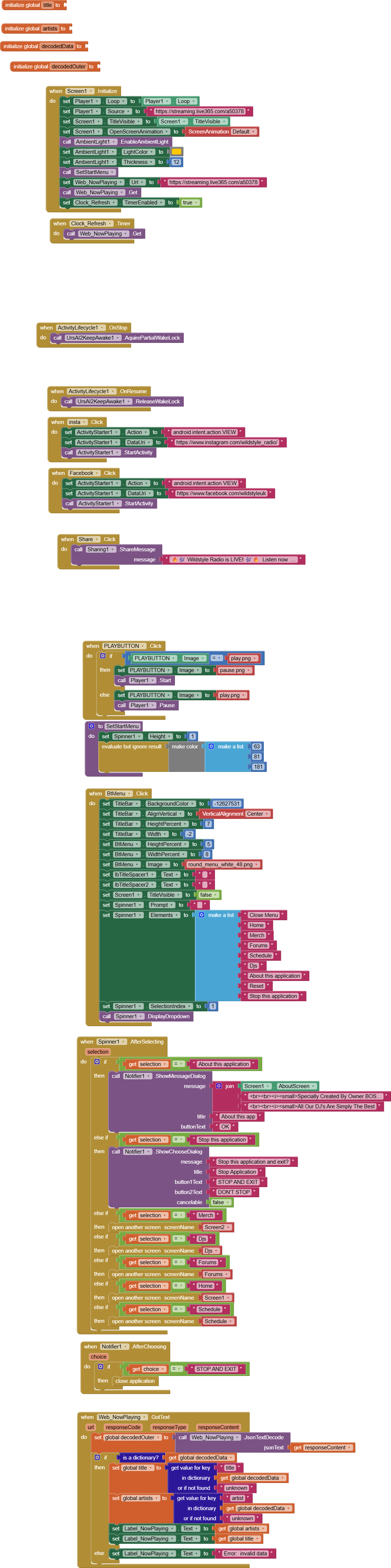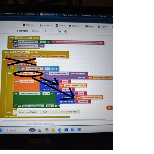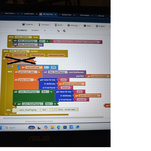 Clock.TimerInterval property (e.g., to 5000 milliseconds for a 5-second refresh).Clock.Timer block, set the Web1.Url to the specific metadata endpoint URL you found (e.g., https://api.live365.com/station/[station_id]/nowplaying).Web1.Get block. This sends the request to the server.When the server responds, the Web1.GotText event is triggered. This block will contain the JSON data.