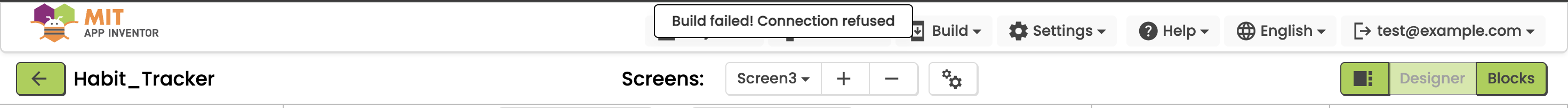 I’m trying to build my Habit Tracker app using MIT App Inventor, but I’m unable to generate the APK file. When I click on “Build → Android App (.apk)”, the build either doesn’t start or fails.