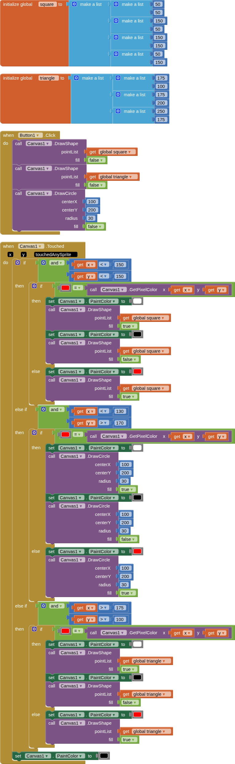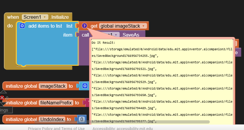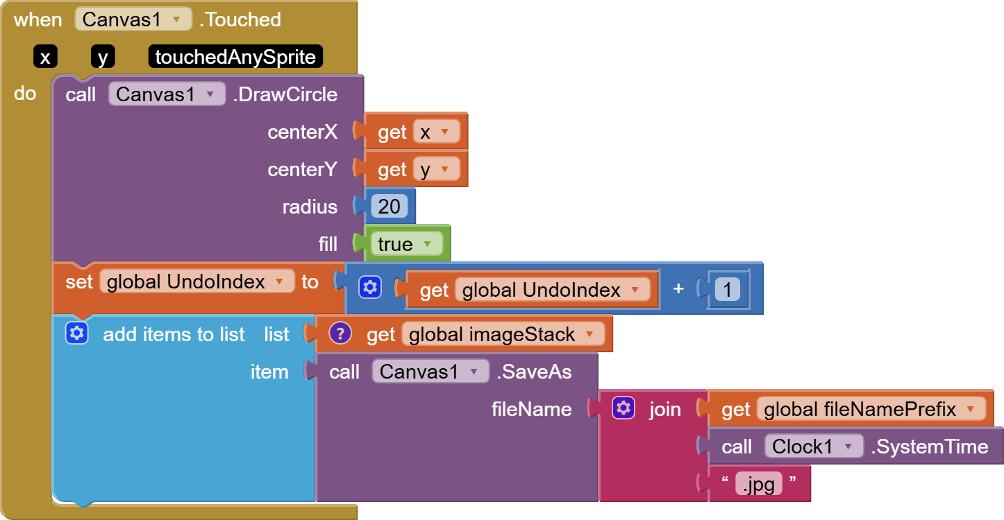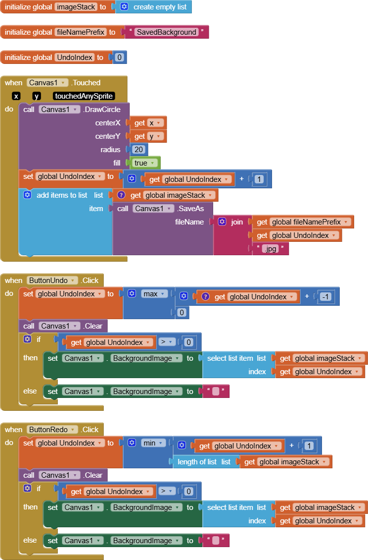 So, for my Undo and Redo Buttons, I used the TinyDB to store the images of the “Current State” and the ”Before Undo State”. However, this only gives me 1 Undo and 1 Redo. So then, I tried to figure out how people create an “Undo Stack History” and “Redo Stack History”. But, I could not figure out where to put all the Blocks that are associated with that method. I was hoping that someone could show the actual Blocks using the “Stack History” as it would relate to this Flood Fill in the Extended Canvas extension. Or, am I missing something with the Undo/Redo Buttons that come with the extension?