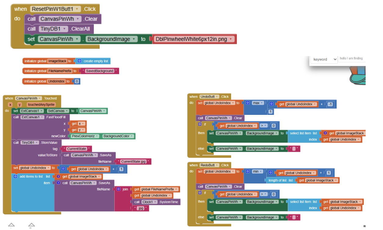 I do use the TinyDB on my later pages, for when I show the Quilt Block again, and when I TempSave and TempLoad. I took it off and tried the Undo, and the last 2 Fills got deleted again, like before. So, I refreshed the computer screen, and all was fine. So, now the only thing left is to figure out the Redo issue.