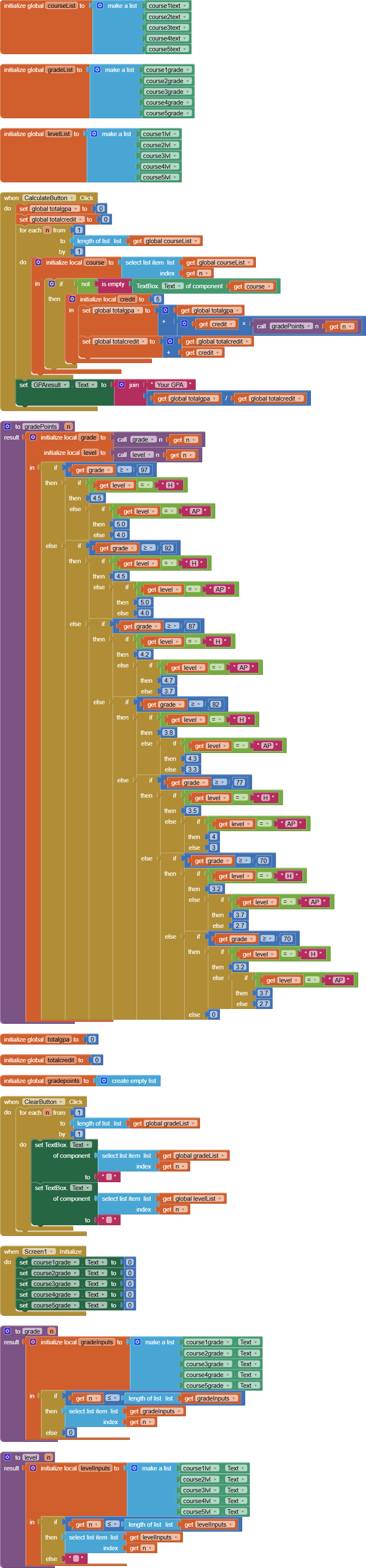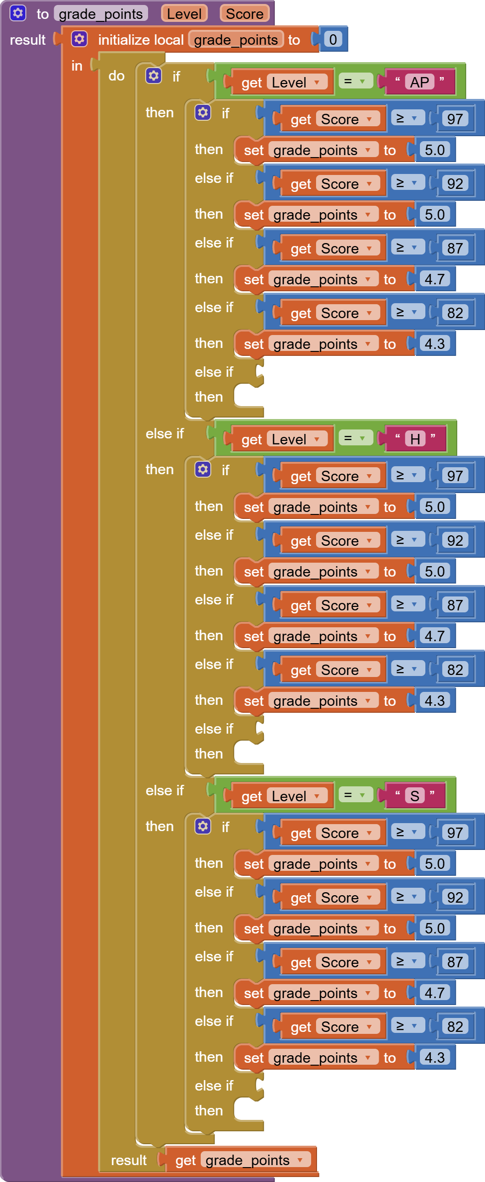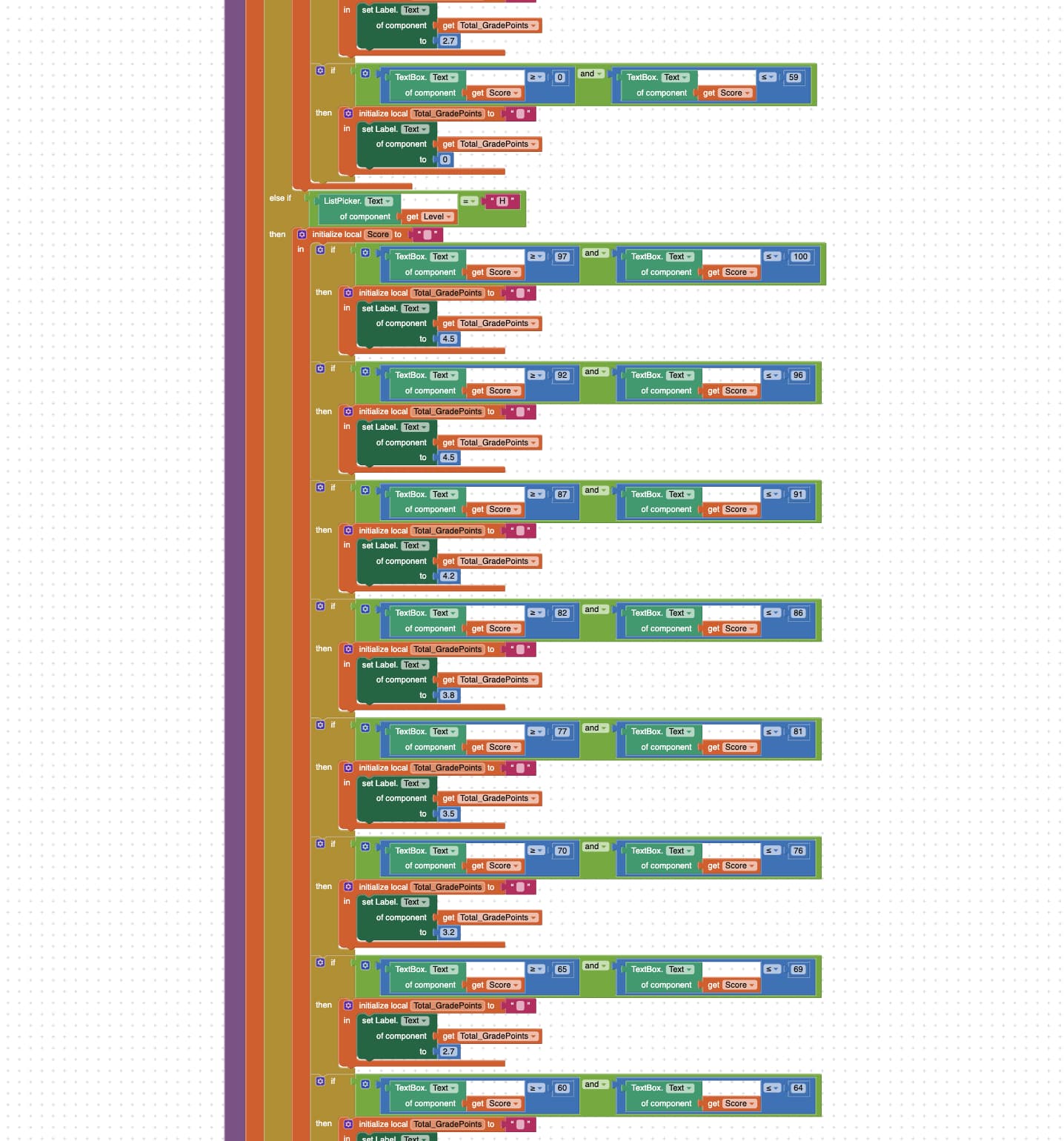The blocks demonstration you gave me appears to be really different from my current plan and design. As shown in the picture, I currently think the major problem is to get the Level I selected with the set of procedure on the right into this big block of total grade point calculation. I still have no idea how to do so.