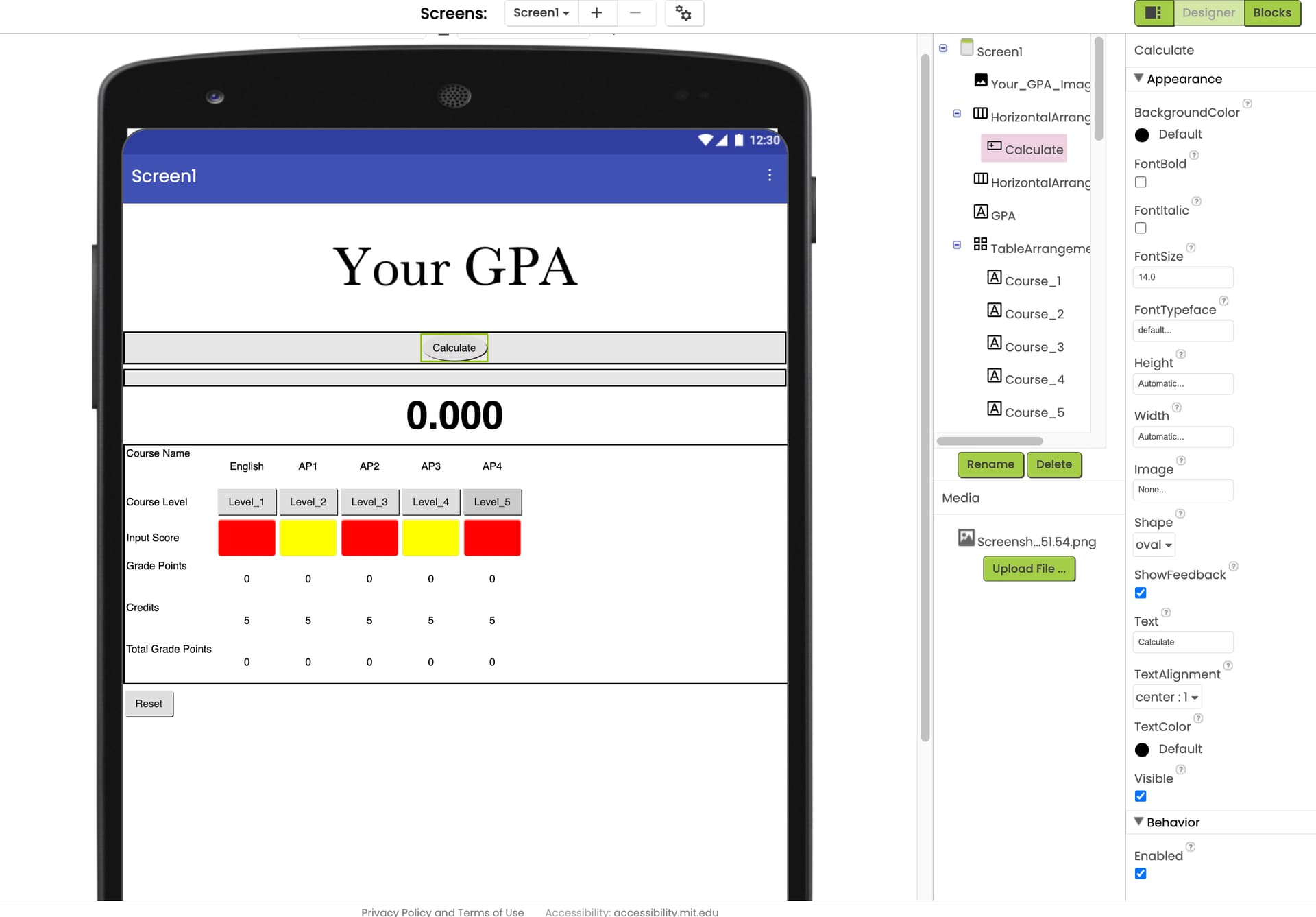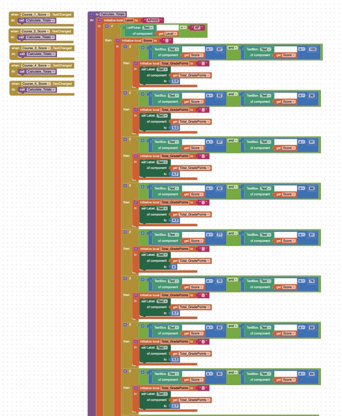 I have made the design and blocks so far, but it seems that the program is not working. Whenever I input a score in the "Input Score" Textbox, the system reports a Runtime Error that shows the following message: