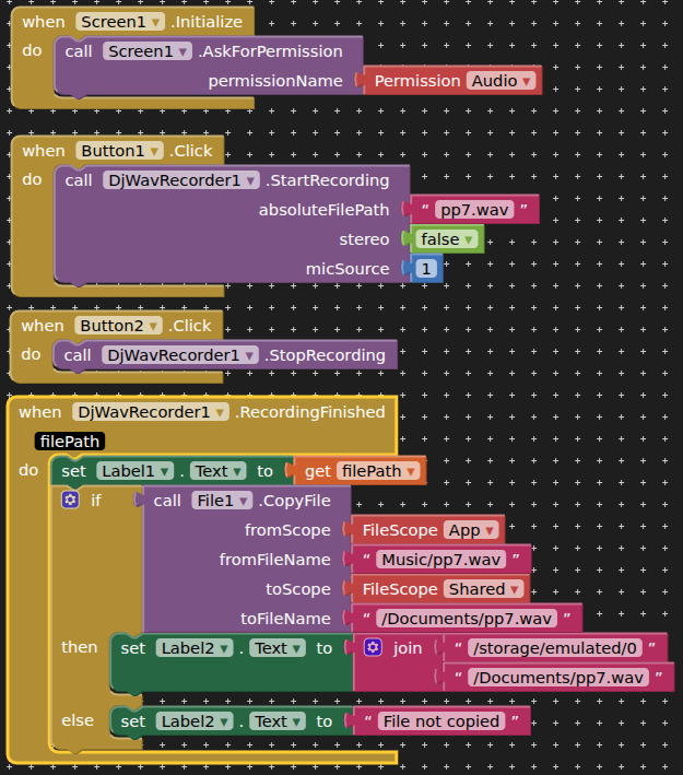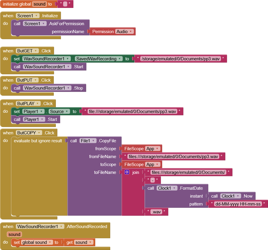 After several hours of trying, I gave up. The blocks in the image work except for the COPY. I need to record some sounds and save them with a name based on the recording's content (DB peaks). How should I write a copy that works?
