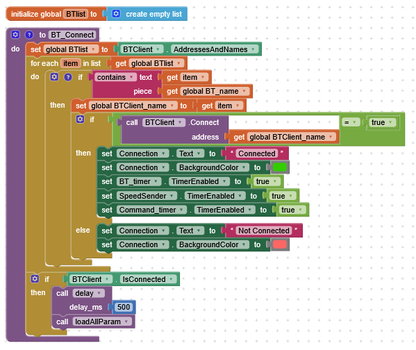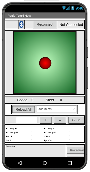 Just for completeness, here is a screenshot of the app. It's just buttons, lables, and text boxes. The red dot is a sprite that can be dragged around to control the robot. But I never touch the screen until the BT connection is established.