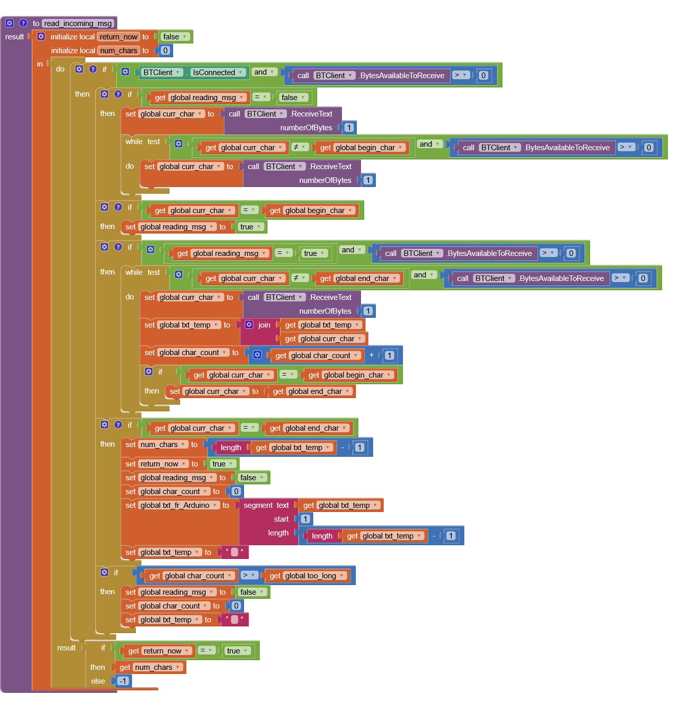 I see you are nibbling away at the Bluetooth input buffer one character at a time in a laborious attempt at grabbing complete messages.