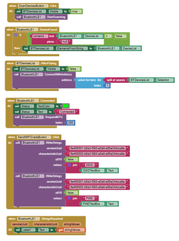 I'd like to use the "when BluetoothLE1.recievedBytes" block, but I'm not getting anything from the "stringsValue" block. In fact, it seems like the "when BluetoothLE1.recievedBytes" isn't even triggering at all.