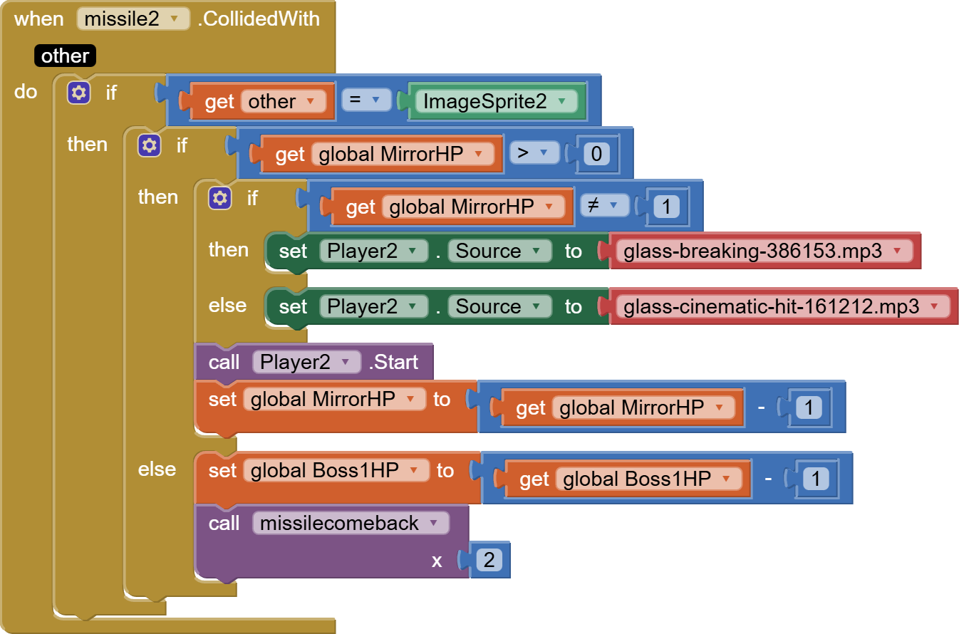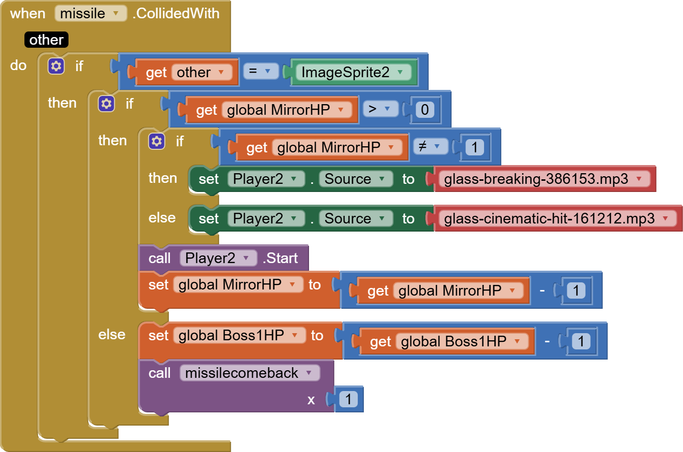 In this code, when a missile collides with ImageSprite2 (enemy), if the HP of the mirror (the "mirror" is supposed to reflect the missile but I haven't implemented that yet) is more than 0, the mirror's HP is reduced by 1 (the "MirrorHP ≠ 1 part decides the sound). If the MirrorHP IS 0, the BossHP is reduced by 1. The "missilecomeback" procedure is supposed to disable and hide the missile (it used to return to the player, thus explaining the name), and the "x" input decides what missile is affected.